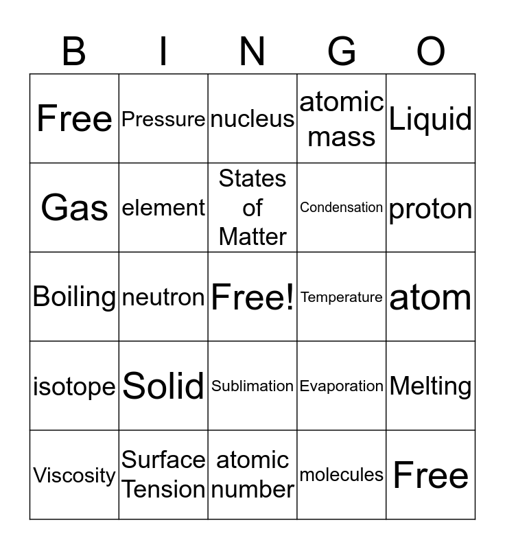 This bingo card has a free space and 24 words: Solid, Surface Tension, States of Matter, Viscosity, Liquid, Free, Gas, Pressure, Temperature, Sublimation, Condensation, Boiling, Evaporation, Melting, element, molecules, atom, nucleus, proton, neutron, Free, isotope, atomic mass and atomic number.