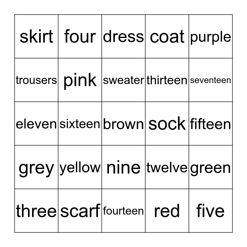 This bingo card has 40 words: orange, eleven, hat, pink, scarf, nine, sweater, seven, purple, grey, sixteen, coat, brown, fifteen, sock, yellow, eighteen, skirt, twenty, dress, green, red, thirteen, trousers, blue, T-shirt, eight, white, five, shirt, black, three, clothes, twelve, seventeen, fourteen, ten, six, four and two.