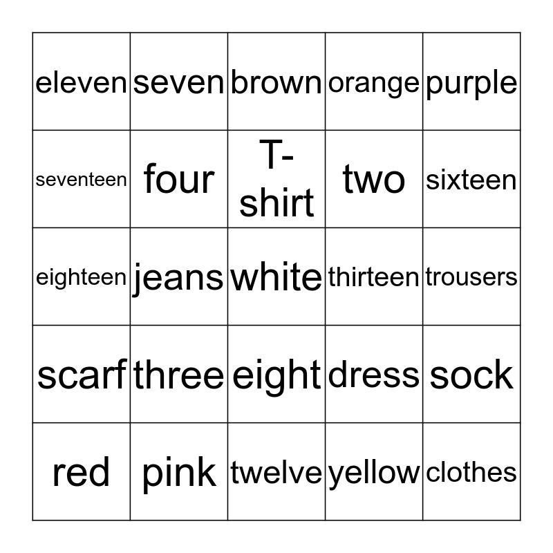 This bingo card has 45 words: black, white, blue, red, green, yellow, brown, grey, purple, pink, orange, thirteen, eight, three, five, twelve, twenty, eighteen, fifteen, sixteen, seven, nine, ten, eleven, one, trousers, shirt, skirt, dress, scarf, sweater, sock, coat, shoes, boots, jeans, hat, bag, clothes, T-shirt, seventeen, two, six, four and nineteen.