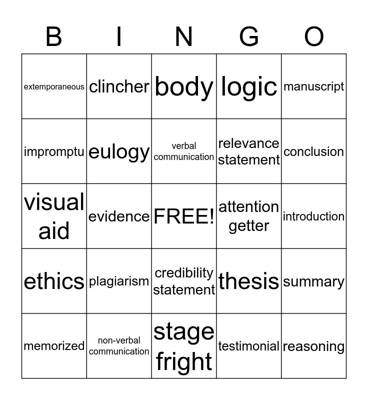 This bingo card has a free space and 24 words: plagiarism, non-verbal communication, verbal communication, memorized, manuscript, extemporaneous, impromptu, clincher, attention getter, credibility statement, relevance statement, visual aid, thesis, summary, eulogy, testimonial, introduction, body, conclusion, evidence, reasoning, ethics, logic and stage fright.