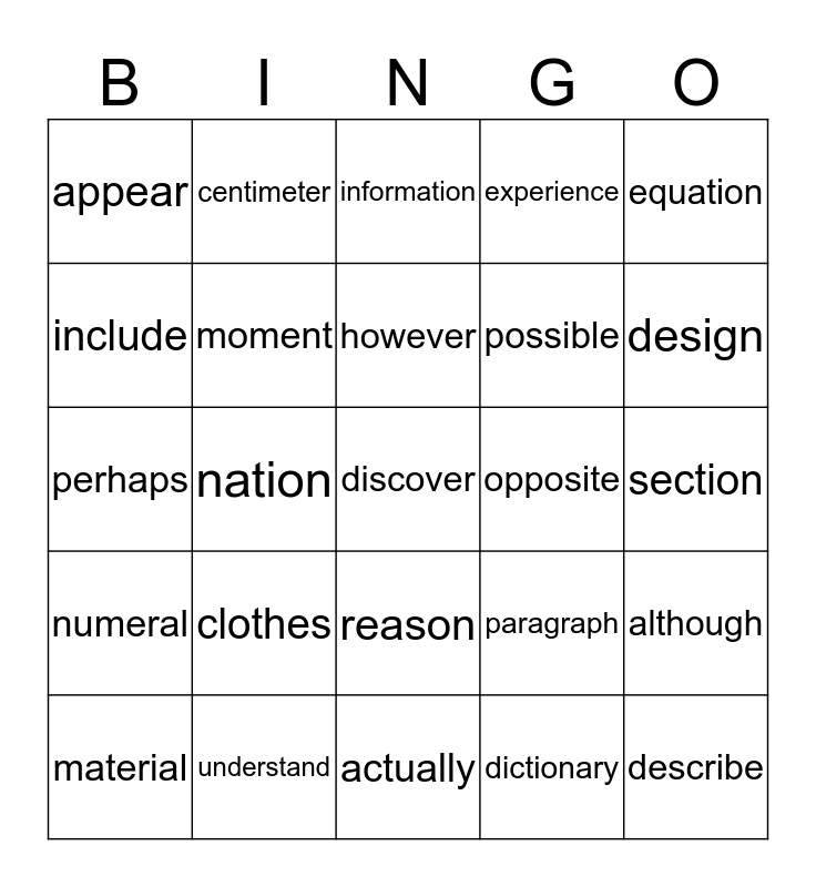 This bingo card has a free space and 24 words: clothes, understand, however, material, equation, appear, include, centimeter, opposite, reason, possible, perhaps, paragraph, although, moment, dictionary, section, information, design, nation, describe, numeral, experience and actually.