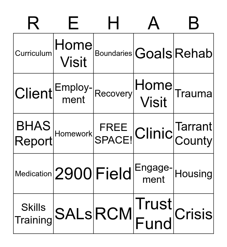 This bingo card has a free space and 24 words: 2900, SALs, Recovery, Skills Training, Rehab, Curriculum, Client, Home Visit, Clinic, Field, Home Visit, BHAS Report, Engage-ment, Housing, Employ-ment, Trust Fund, Tarrant County, Boundaries, Trauma, Homework, Crisis, Medication, Goals and RCM.