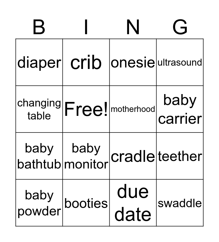 This bingo card has 26 words: diaper rash, teddy bear, baby carrier, baby, changing table, diaper, Free!, crib, due date, bib, baby bathtub, cradle, baby swing, baby sitter, teether, rubber duckie, ultrasound, swaddle, onesie, baby powder, baby monitor, pacifier, booties, mobile, motherhood and high chair.