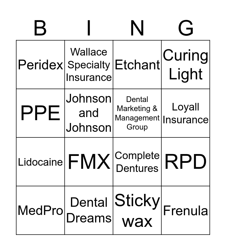 This bingo card has 52 words: Free!, MedPro, Jefferson Dental, GlaxoSmithKline, Pacific Dental Services, Fortress Insurance, Wallace Specialty Insurance, Heartland Dental, Johnson and Johnson, Colgate, Dental Marketing & Management Group, Crest/OralB, Lumadent, Aspen Dental, Quality Aspirators/Q-Optics, Western Dental/Brident, Loyall Insurance, Dental Dreams, Thompson Stick, PPE, RPD, Post & Core, Peridex, Lidocaine, Disclosing Wax, Loupes, Prophy, Articulator, FMX, Master Impression, Mounting Stone, Curing Light, 92 Elevator, BiteBlock, Filtek Supreme, Etchant, Gutta Percha, Dr Dodgeball, Mandiball, Alginate, Heliomolar, Sticky wax, Frenula, Alveolar, Dentin, Enamel, Pulpal exposure, Complete Dentures, Porcelain Crown, Biologic Width, Axium and Maxilla.