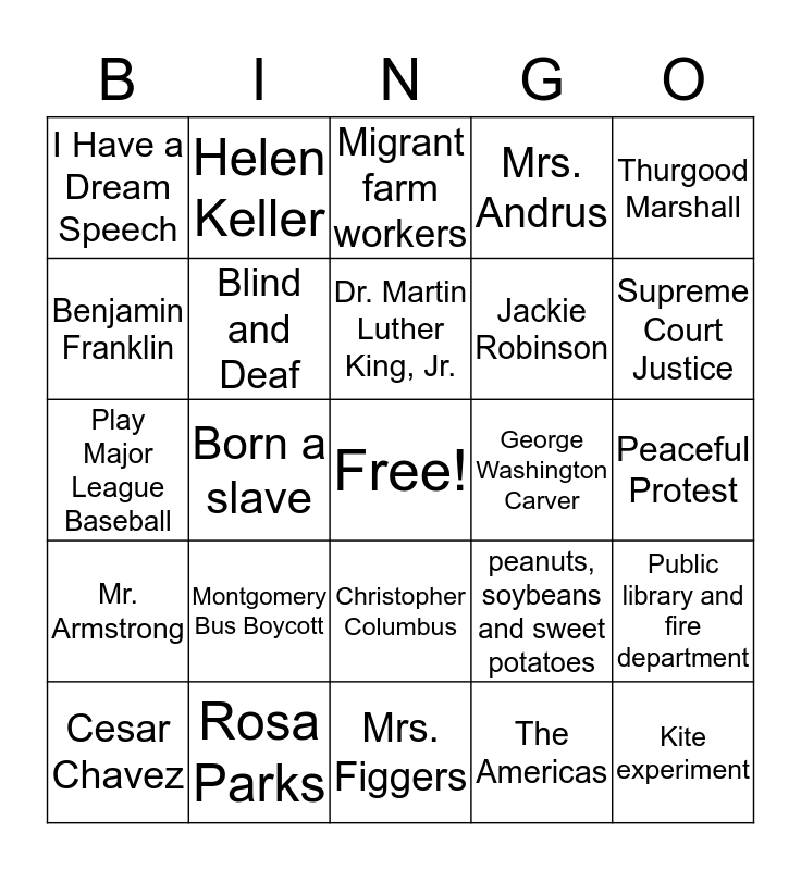 This bingo card has a free space and 24 words: Montgomery Bus Boycott, Rosa Parks, Dr. Martin Luther King, Jr., Cesar Chavez, Thurgood Marshall, I Have a Dream Speech, Benjamin Franklin, Helen Keller, George Washington Carver, Christopher Columbus, Jackie Robinson, Play Major League Baseball, peanuts, soybeans and sweet potatoes, Public library and fire department, Blind and Deaf, The Americas, Peaceful Protest, Migrant farm workers, Supreme Court Justice, Born a slave, Kite experiment, Mr. Armstrong, Mrs. Andrus and Mrs. Figgers.