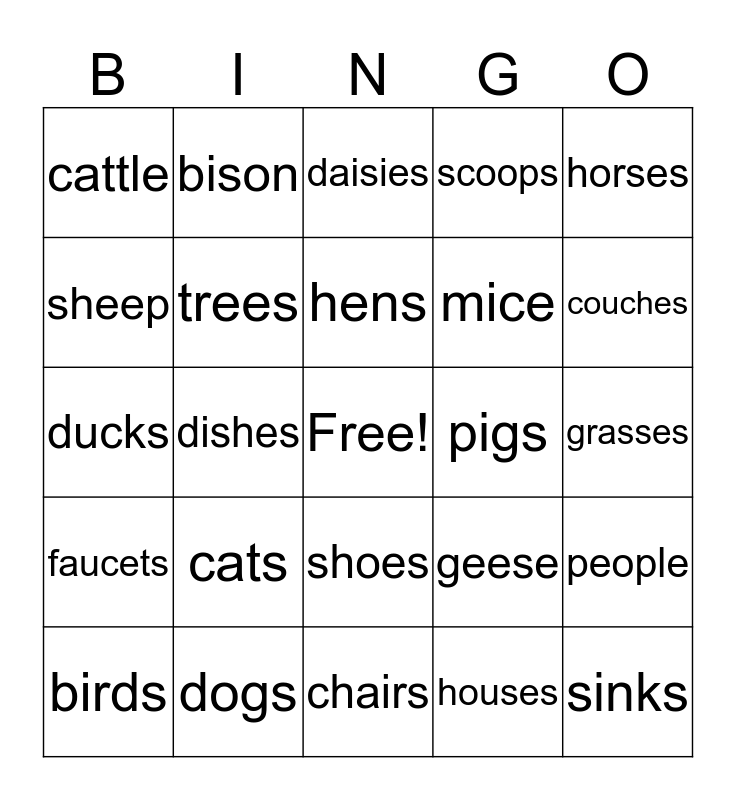 This bingo card has a free space and 24 words: cats, dogs, hens, birds, horses, cattle, sheep, bison, pigs, shoes, mice, ducks, geese, people, trees, houses, grasses, daisies, couches, dishes, sinks, faucets, scoops and chairs.