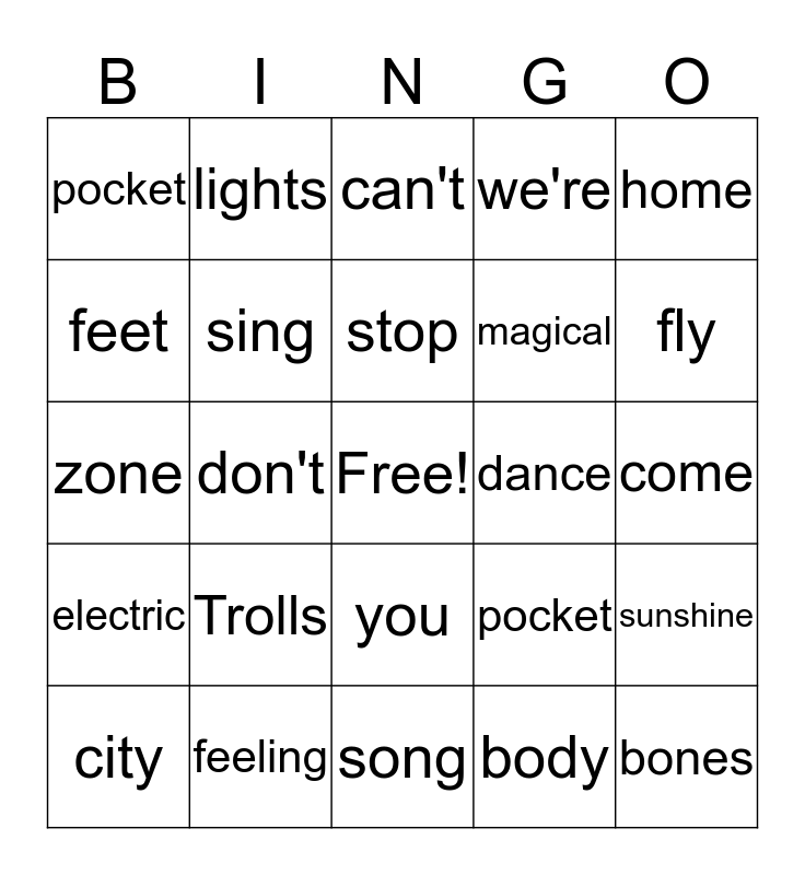 This bingo card has a free space and 24 words: Trolls, feeling, stop, city, home, pocket, feet, lights, dance, you, magical, zone, pocket, sunshine, sing, body, come, can't, fly, don't, bones, electric, we're and song.