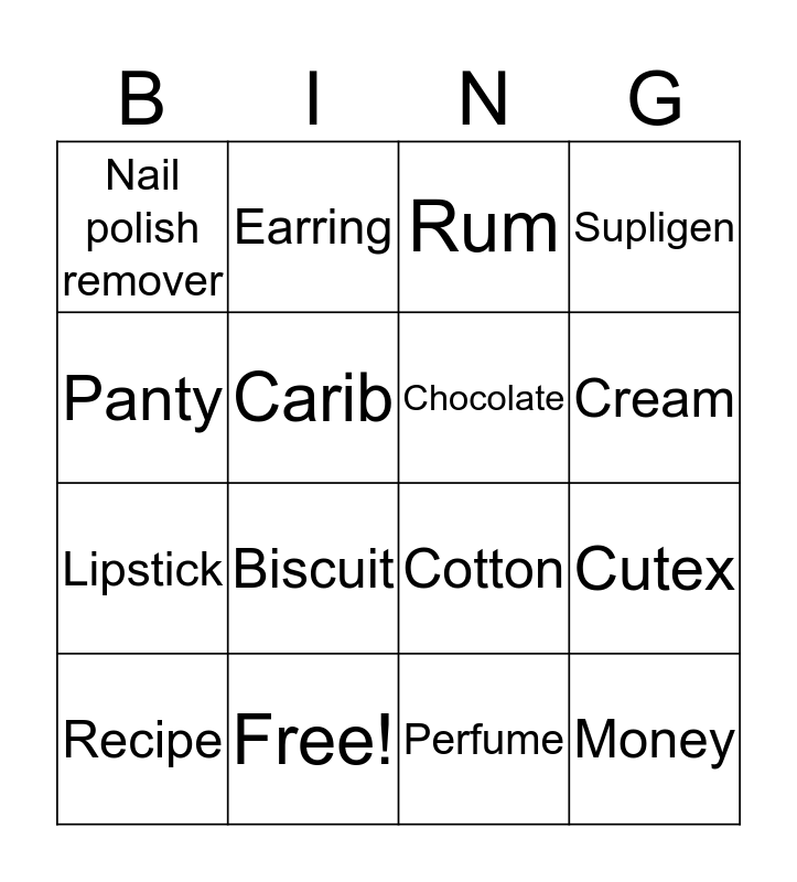 This bingo card has 16 words: Free!, Cutex, Rum, Nail polish remover, Lipstick, Earring, Cotton, Perfume, Panty, Carib, Recipe, Supligen, Biscuit, Cream, Chocolate and Money.