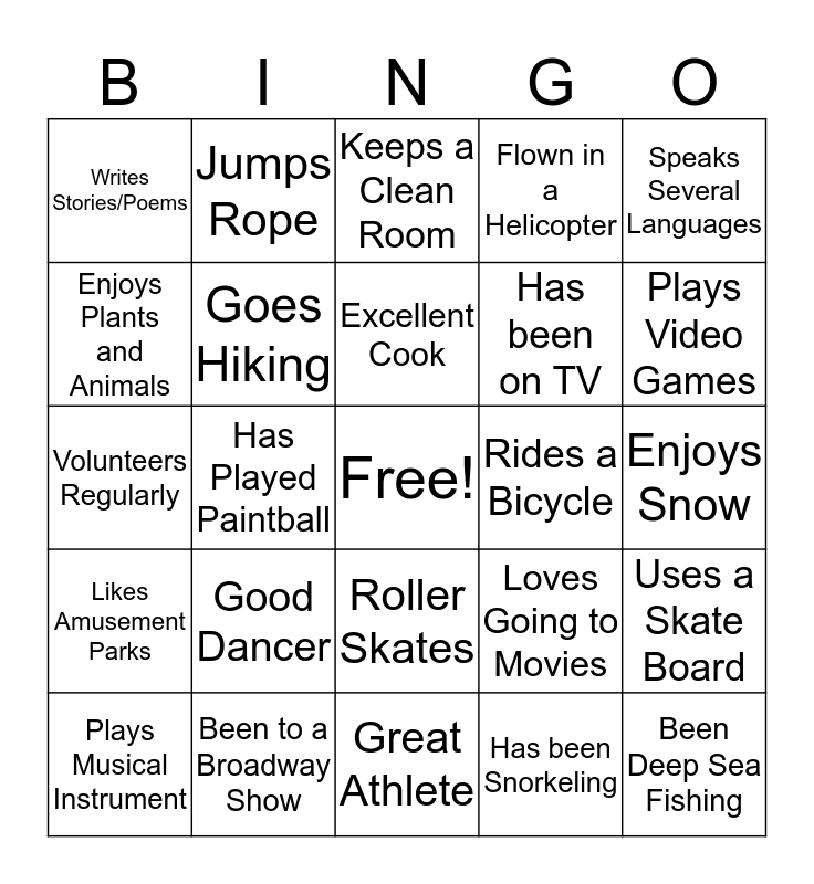 This bingo card has a free space and 25 words: Good Dancer, Great Athlete, Excellent Cook, Plays Musical Instrument, Speaks Several Languages, Writes Stories/Poems, Enjoys Plants and Animals, Jumps Rope, Rides a Bicycle, Roller Skates, Has been on TV, Volunteers Regularly, Loves Going to Movies, Uses a Skate Board, Goes Hiking, Likes Crossword Puzzles, Enjoys Snow, Keeps a Clean Room, Plays Video Games, Has Played Paintball, Been Deep Sea Fishing, Been to a Broadway Show, Likes Amusement Parks, Flown in a Helicopter and Has been Snorkeling.