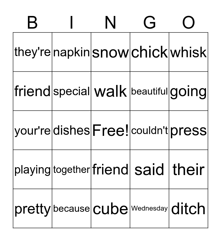 This bingo card has a free space and 24 words: together, because, walk, pretty, whisk, they're, friend, napkin, couldn't, friend, beautiful, your're, said, their, special, Wednesday, press, snow, going, dishes, ditch, playing, chick and cube.