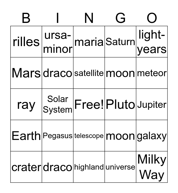 This bingo card has a free space and 24 words: Pegasus, draco, satellite, crater, light-years, rilles, Mars, ursa-minor, Pluto, telescope, moon, ray, moon, galaxy, draco, universe, Jupiter, maria, meteor, Solar System, Milky Way, Earth, Saturn and highland.