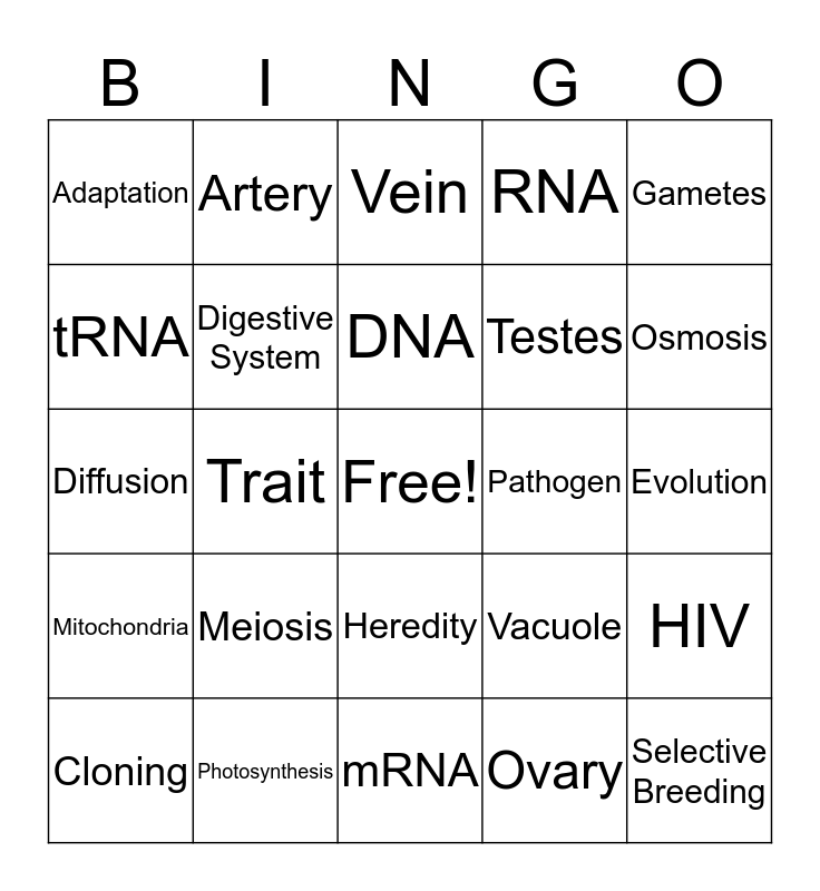 This bingo card has a free space and 34 words: Mitosis, Ovary, Replication, Enzyme, Mitochondria, Digestive System, Gametes, Cloning, Artery, Capillary, DNA, Vein, Respiratory System, White Blood Cell, Pathogen, Osmosis, Photosynthesis, Diffusion, Meiosis, Vacuole, Heredity, Golgi body, Adaptation, Evolution, mRNA, Selective Breeding, RNA, Codon, Testes, tRNA, Hormone, Trait, HIV and Homeostasis.