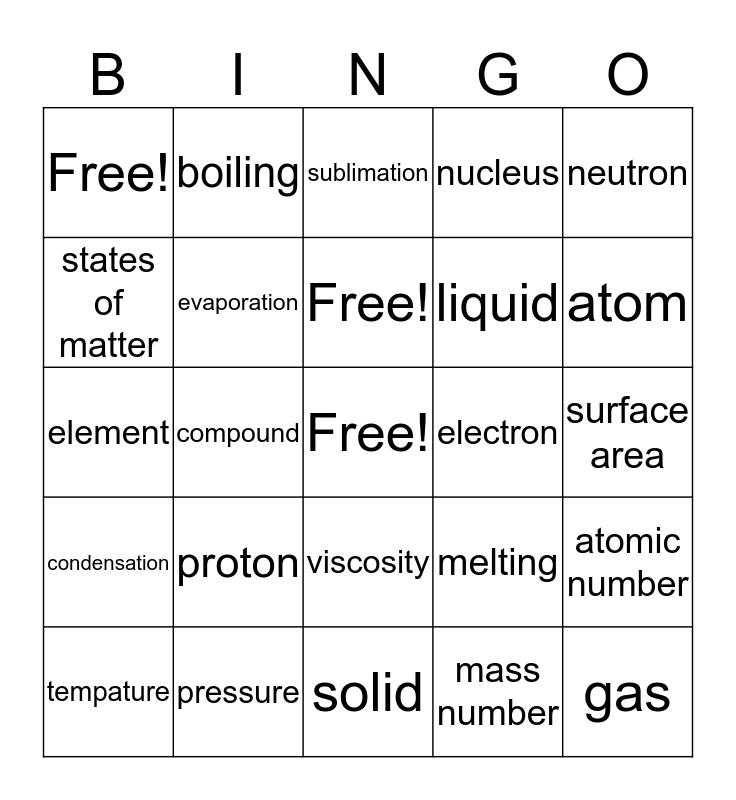 This bingo card has a free space and 24 words: proton, pressure, Free!, tempature, neutron, Free!, states of matter, boiling, electron, viscosity, liquid, element, melting, atomic number, evaporation, mass number, surface area, sublimation, atom, compound, gas, condensation, nucleus and solid.