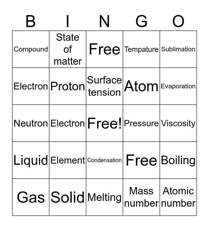 This bingo card has a free space and 24 words: Element, Solid, Surface tension, Gas, Sublimation, Compound, Electron, State of matter, Pressure, Condensation, Atom, Neutron, Free, Boiling, Proton, Mass number, Viscosity, Free, Evaporation, Electron, Atomic number, Liquid, Tempature and Melting.