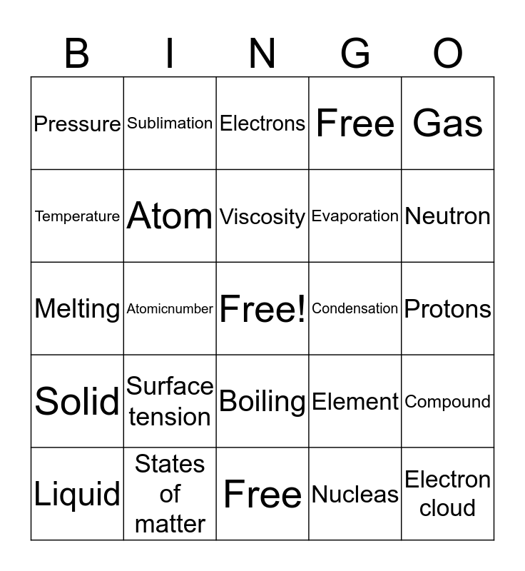 This bingo card has a free space and 24 words: Surface tension, States of matter, Viscosity, Liquid, Gas, Pressure, Temperature, Sublimation, Condensation, Boiling, Evaporation, Melting, Element, Compound, Atom, Nucleas, Protons, Electrons, Neutron, Atomicnumber, Electron cloud, Solid, Free and Free.