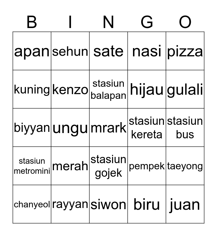 This bingo card has a free space and 24 words: merah, rayyan, stasiun balapan, chanyeol, pizza, apan, kuning, sehun, stasiun kereta, stasiun gojek, hijau, biyyan, pempek, taeyong, kenzo, biru, stasiun bus, sate, gulali, ungu, juan, stasiun metromini, nasi and siwon.