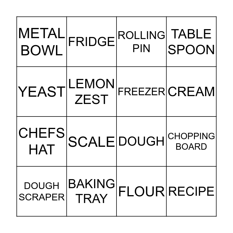 This bingo card has 16 words: BAKING TRAY, CHOPPING BOARD, ROLLING PIN, METAL BOWL, CHEFS HAT, FRIDGE, DOUGH, FLOUR, YEAST, LEMON ZEST, DOUGH SCRAPER, TABLE SPOON, SCALE, CREAM, FREEZER and RECIPE.