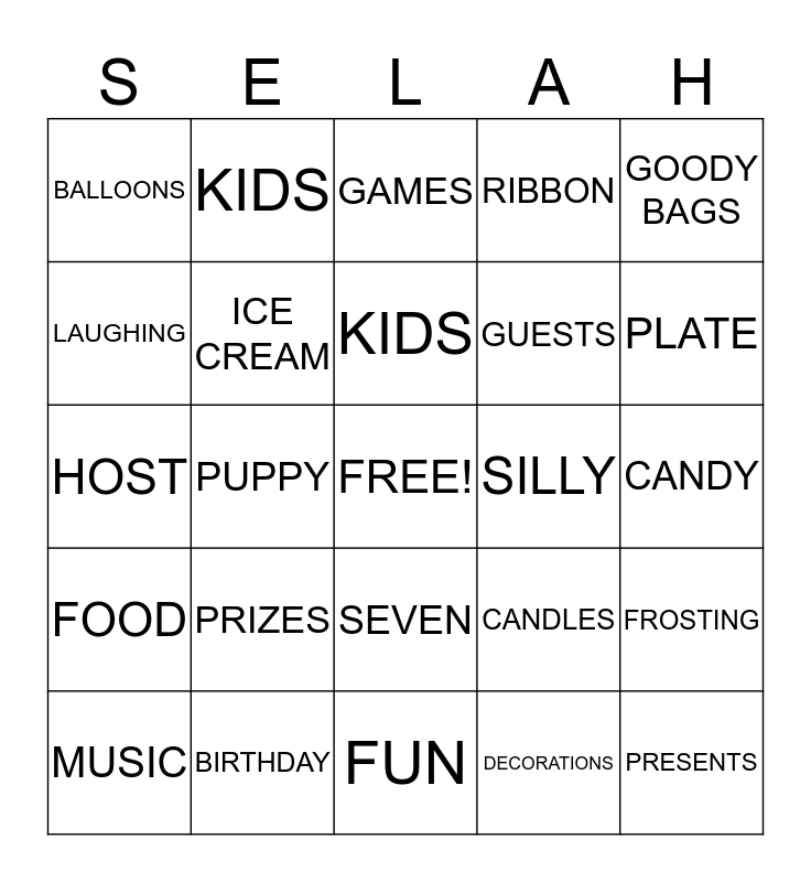 This bingo card has a free space and 30 words: BIRTHDAY, PARTY, PUPPY, CAKE, BALLOONS, GAMES, ICE CREAM, SEVEN, SILLY, FUN, CANDY, PRESENTS, DECORATIONS, FORK, PLATE, NAPKIN, CANDLES, FOOD, PRIZES, GOODY BAGS, HOST, PARENTS, KIDS, GUESTS, LAUGHING, RIBBON, FROSTING, MUSIC, KIDS and WRAPPING PAPER.