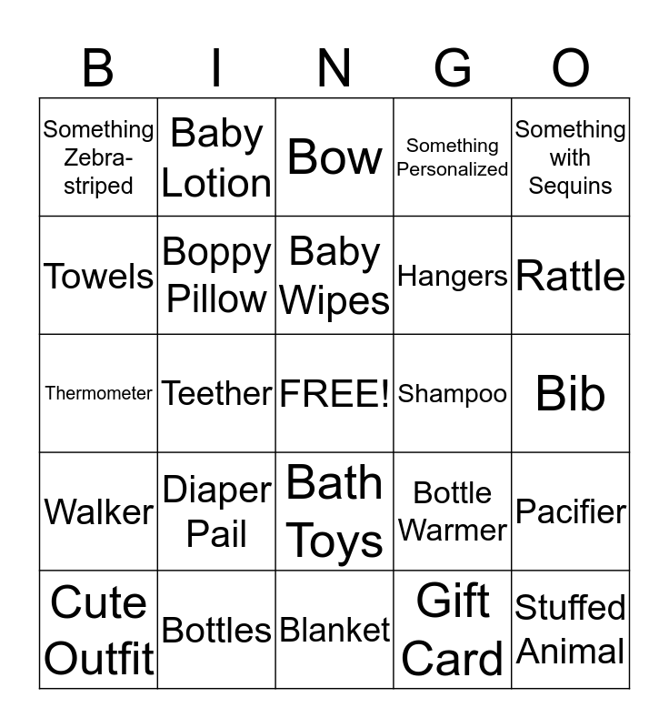 This bingo card has a free space and 24 words: Diaper Pail, Bottles, Baby Wipes, Cute Outfit, Something with Sequins, Something Zebra-striped, Towels, Baby Lotion, Shampoo, Bath Toys, Hangers, Thermometer, Bottle Warmer, Pacifier, Boppy Pillow, Gift Card, Bib, Bow, Rattle, Teether, Stuffed Animal, Walker, Something Personalized and Blanket.