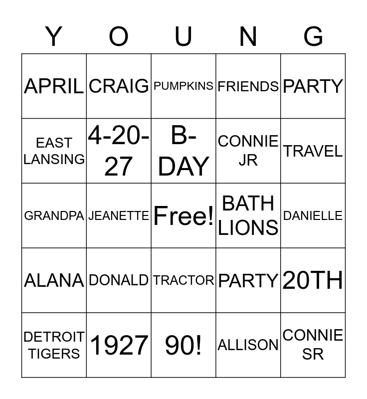 This bingo card has a free space and 24 words: DONALD, 1927, B-DAY, DETROIT TIGERS, PARTY, APRIL, EAST LANSING, CRAIG, BATH LIONS, TRACTOR, CONNIE JR, GRANDPA, PARTY, 20TH, 4-20-27, ALLISON, DANIELLE, PUMPKINS, TRAVEL, JEANETTE, CONNIE SR, ALANA, FRIENDS and 90!.
