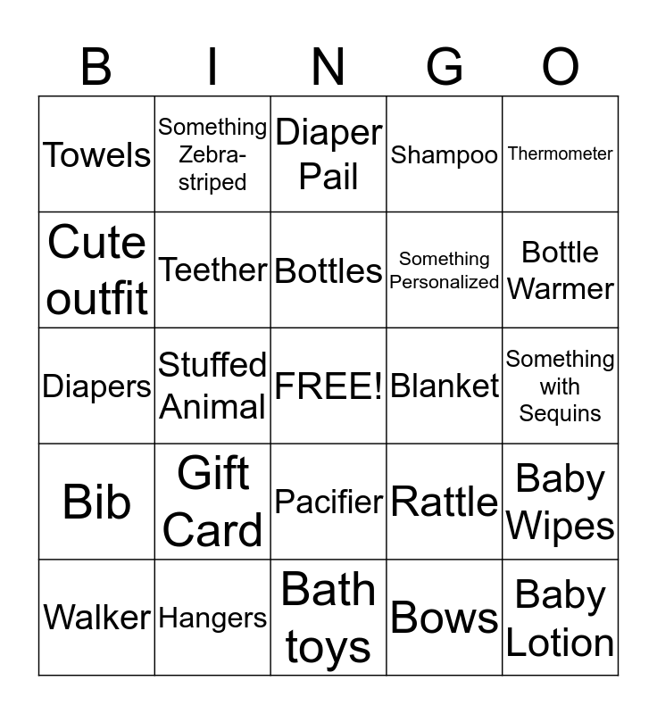 This bingo card has a free space and 24 words: Gift Card, Hangers, Bottles, Walker, Thermometer, Towels, Cute outfit, Something Zebra-striped, Blanket, Pacifier, Something Personalized, Diapers, Rattle, Baby Wipes, Teether, Bows, Something with Sequins, Diaper Pail, Bottle Warmer, Stuffed Animal, Baby Lotion, Bib, Shampoo and Bath toys.