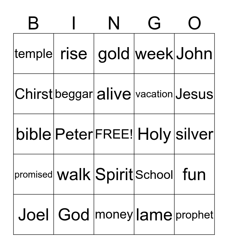 This bingo card has a free space and 24 words: walk, God, alive, Joel, John, temple, Chirst, rise, Holy, Spirit, vacation, bible, School, fun, beggar, lame, silver, gold, Jesus, Peter, prophet, promised, week and money.
