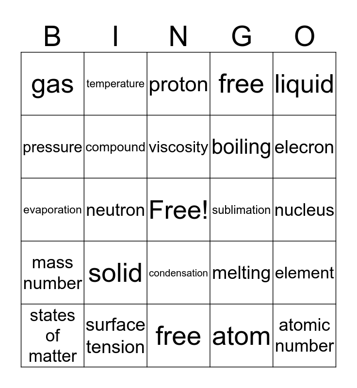 This bingo card has a free space and 24 words: solid, surface tension, viscosity, states of matter, liquid, gas, pressure, temperature, sublimation, condensation, boiling, evaporation, melting, element, compound, atom, nucleus, proton, elecron, neutron, atomic number, mass number, free and free.