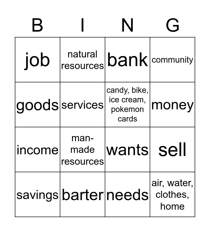 This bingo card has 16 words: barter, sell, bank, job, income, natural resources, wants, needs, goods, services, savings, community, man-made resources, money, candy, bike, ice cream, pokemon cards and air, water, clothes, home.