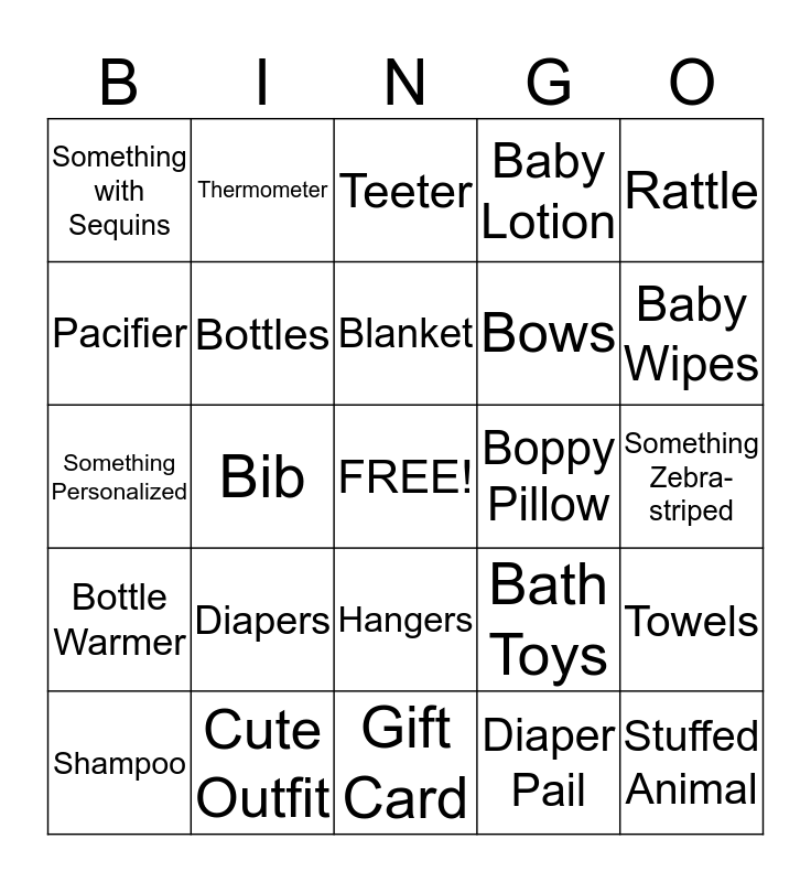 This bingo card has a free space and 24 words: Diapers, Cute Outfit, Blanket, Shampoo, Rattle, Something with Sequins, Pacifier, Thermometer, Boppy Pillow, Hangers, Bows, Something Personalized, Bath Toys, Towels, Bottles, Diaper Pail, Something Zebra-striped, Teeter, Baby Wipes, Bib, Stuffed Animal, Bottle Warmer, Baby Lotion and Gift Card.
