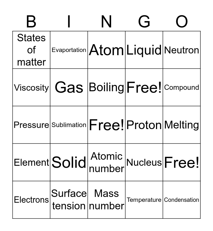 This bingo card has a free space and 24 words: Solid, Surface tension, Boiling, Electrons, Neutron, States of matter, Viscosity, Evaportation, Proton, Atomic number, Free!, Pressure, Nucleus, Free!, Gas, Temperature, Melting, Atom, Compound, Sublimation, Condensation, Element, Liquid and Mass number.