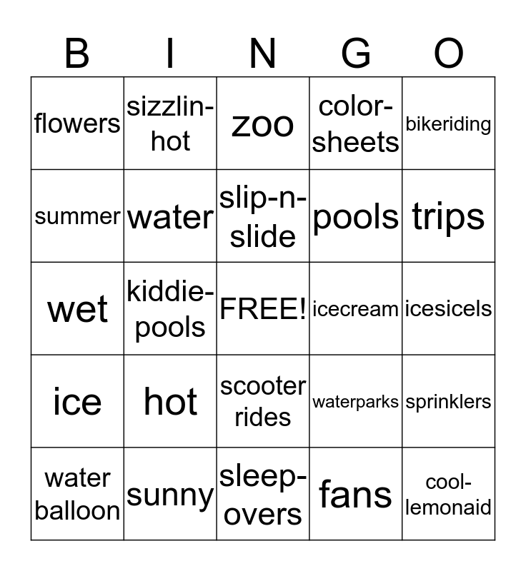 This bingo card has a free space and 24 words: hot, sunny, slip-n-slide, water balloon, bikeriding, flowers, summer, sizzlin-hot, icecream, scooter rides, pools, wet, waterparks, sprinklers, water, fans, icesicels, zoo, trips, kiddie-pools, cool-lemonaid, ice, color-sheets and sleep-overs.