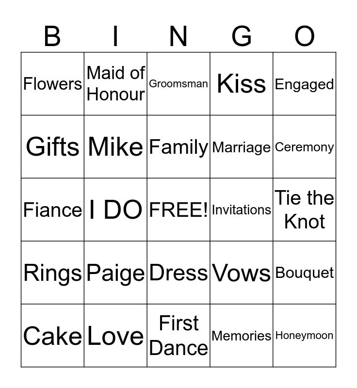 This bingo card has a free space and 24 words: Paige, Love, Family, Cake, Engaged, Flowers, Gifts, Maid of Honour, Invitations, Dress, Marriage, Fiance, Vows, Bouquet, Mike, Memories, Tie the Knot, Groomsman, Ceremony, I DO, Honeymoon, Rings, Kiss and First Dance.