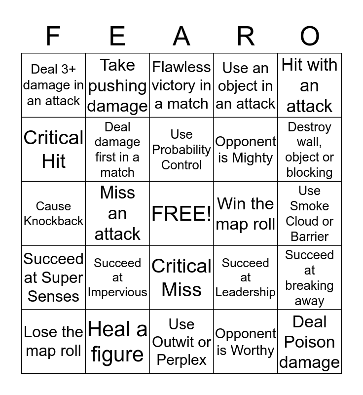 This bingo card has a free space and 24 words: Succeed at Impervious, Heal a figure, Use Probability Control, Lose the map roll, Hit with an attack, Deal 3+ damage in an attack, Critical Hit, Take pushing damage, Win the map roll, Critical Miss, Opponent is Mighty, Cause Knockback, Succeed at Leadership, Succeed at breaking away, Deal damage first in a match, Opponent is Worthy, Use Smoke Cloud or Barrier, Flawless victory in a match, Destroy wall, object or blocking, Miss an attack, Deal Poison damage, Succeed at Super Senses, Use an object in an attack and Use Outwit or Perplex.