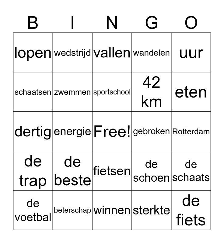 This bingo card has a free space and 35 words: sport, bewegen, gezond, zwemmen, fietsen, wandelen, schaatsen, voetballen, sportschool, fitness, dertig, uur, traplopen, elke dag, lopen, gebroken, sterkte, energie, de trap, de fiets, de schoen, de voetbal, de schaats, beterschap, vallen, eten, marathon, drinken, 42 km, Rotterdam, record, winnen, de beste, wedstrijd and gewonnen.
