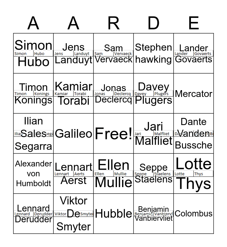 This bingo card has 18 images, a free space and 24 words: Lennart Aerst, Viktor De Smyter, Jonas Declercq, Lennard Derudder, Lander Govaerts, Simon Hubo, Timon Konings, Jens Landuyt, Jari Malfliet, Ellen Mullie, Davey Plugers, Ilian Sales Segarra, Seppe Staelens, Lotte Thys, Kamiar Torabi, Benjamin Vanbiervliet, Dante Vanden Bussche, Sam Vervaeck, Mercator, Galileo, Colombus, Alexander von Humboldt, Stephen hawking and Hubble.