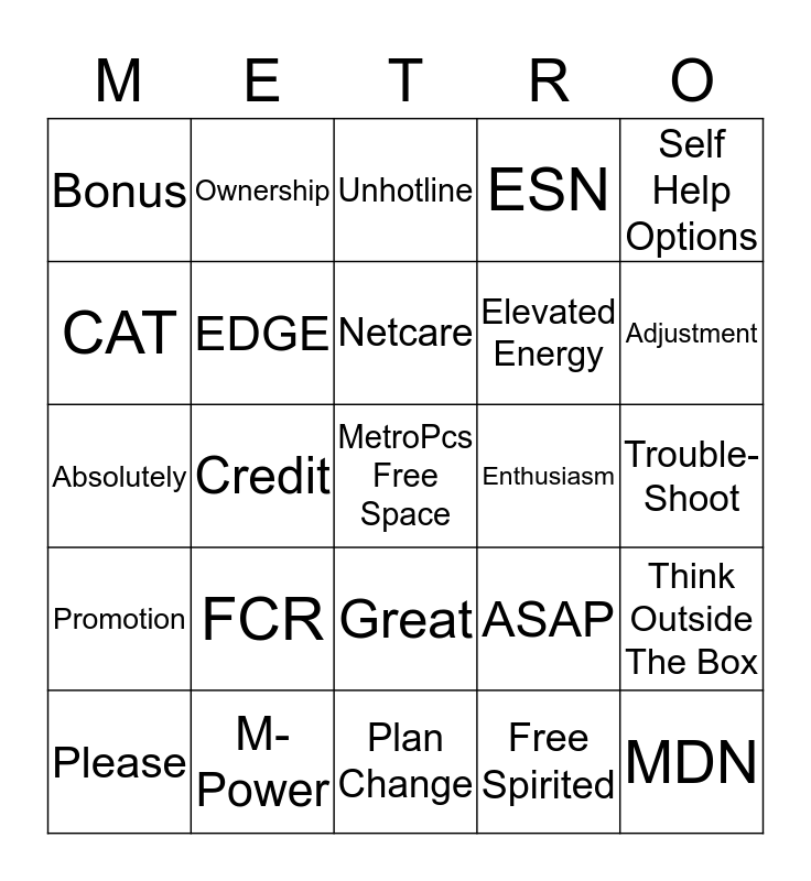 This bingo card has a free space and 24 words: FCR, M- Power, Netcare, Please, Self Help Options, Bonus, CAT, Ownership, Enthusiasm, Great, Elevated Energy, Absolutely, ASAP, Think Outside The Box, EDGE, Free Spirited, Trouble- Shoot, Unhotline, Adjustment, Credit, MDN, Promotion, ESN and Plan Change.