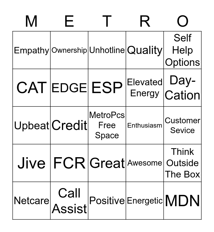 This bingo card has a free space and 24 words: FCR, Call Assist, ESP, Netcare, Self Help Options, Empathy, CAT, Ownership, Enthusiasm, Great, Elevated Energy, Upbeat, Awesome, Think Outside The Box, EDGE, Energetic, Customer Sevice, Unhotline, Day- Cation, Credit, MDN, Jive, Quality and Positive.