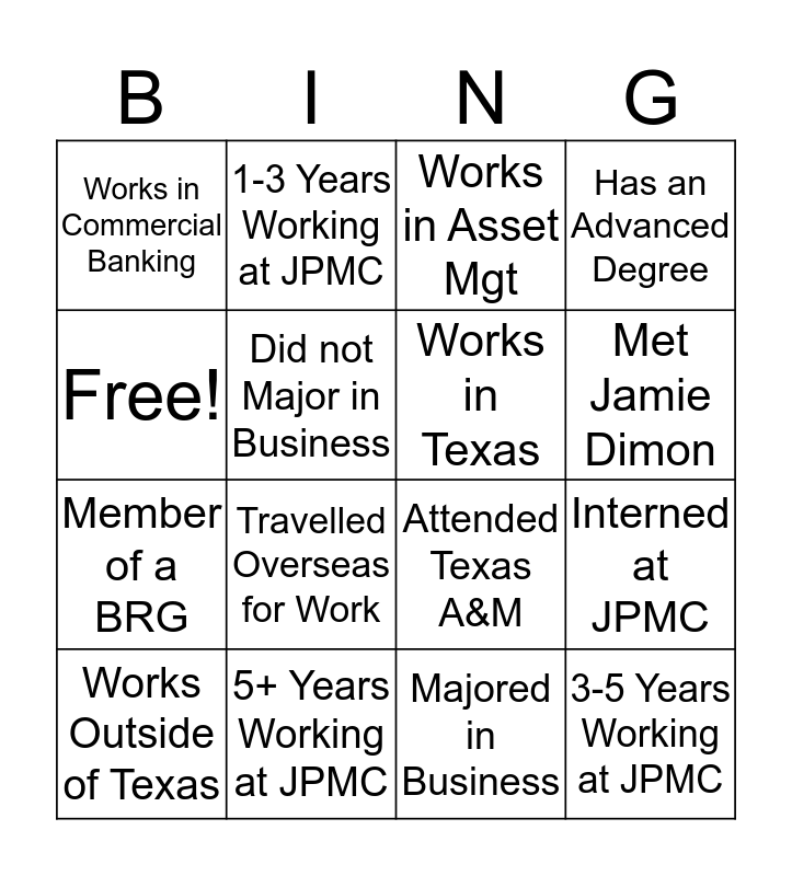 This bingo card has 16 words: 5+ Years Working at JPMC, Interned at JPMC, Works in Asset Mgt, Works in Commercial Banking, Member of a BRG, 1-3 Years Working at JPMC, Attended Texas A&M, Majored in Business, Free!, Did not Major in Business, Works Outside of Texas, Has an Advanced Degree, Travelled Overseas for Work, Met Jamie Dimon, Works in Texas and 3-5 Years Working at JPMC.