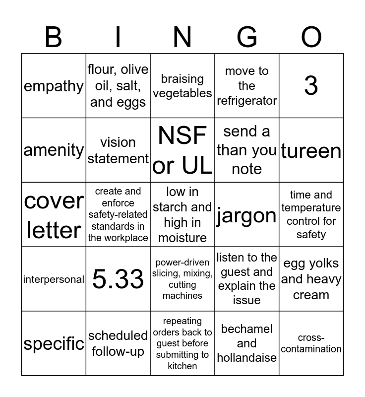 This bingo card has a free space and 24 words: 5.33, scheduled follow-up, NSF or UL, specific, 3, empathy, amenity, flour, olive oil, salt, and eggs, jargon, power-driven slicing, mixing, cutting machines, send a than you note, cover letter, listen to the guest and explain the issue, egg yolks and heavy cream, vision statement, bechamel and hollandaise, time and temperature control for safety, braising vegetables, tureen, create and enforce safety-related standards in the workplace, cross-contamination, interpersonal, move to the refrigerator and repeating orders back to guest before submitting to kitchen.