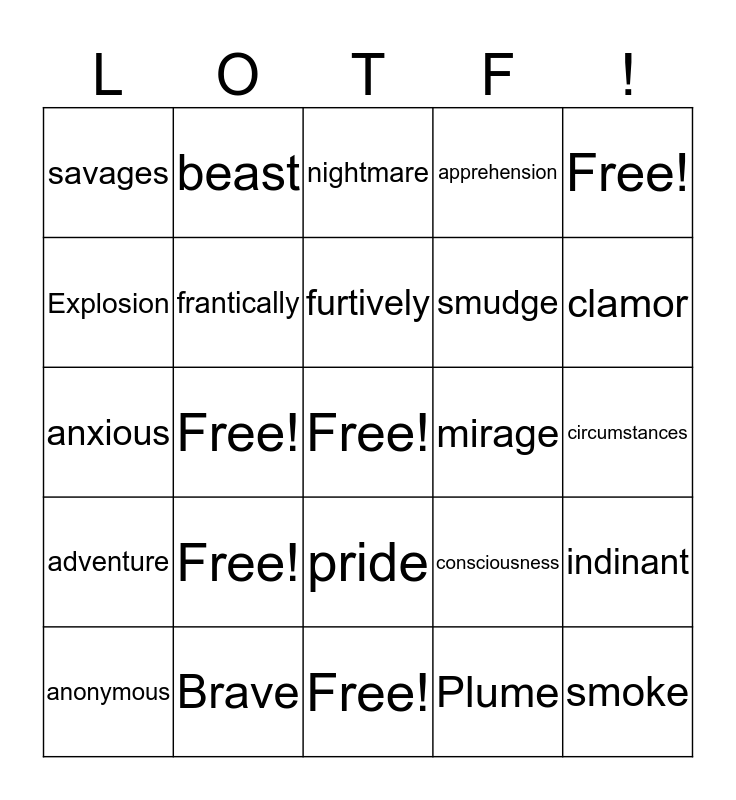 This bingo card has a free space and 24 words: Free!, Brave, furtively, anonymous, Free!, savages, Explosion, beast, mirage, pride, smudge, anxious, consciousness, indinant, frantically, Plume, circumstances, nightmare, clamor, Free!, smoke, adventure, apprehension and Free!.