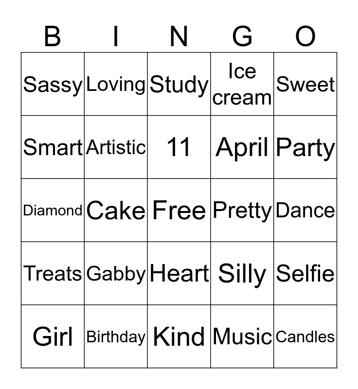 This bingo card has a free space and 24 words: Gabby, Birthday, 11, Girl, Sweet, Sassy, Smart, Loving, Pretty, Heart, April, Diamond, Silly, Selfie, Artistic, Music, Dance, Study, Party, Cake, Candles, Treats, Ice cream and Kind.