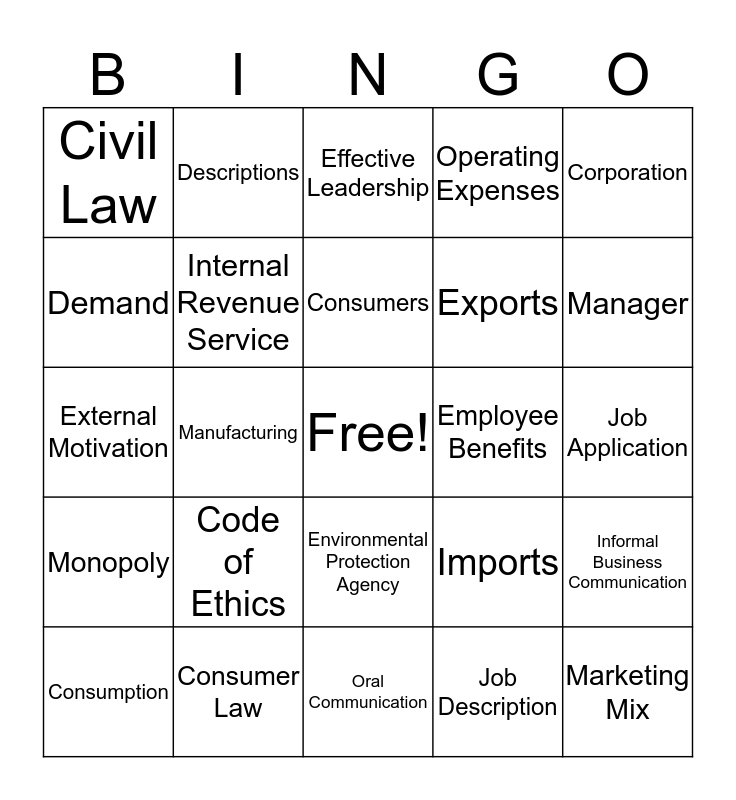 This bingo card has a free space and 24 words: Code of Ethics, Consumer Law, Consumers, Consumption, Corporation, Civil Law, Demand, Descriptions, Employee Benefits, Environmental Protection Agency, Exports, External Motivation, Imports, Informal Business Communication, Internal Revenue Service, Job Description, Job Application, Effective Leadership, Manager, Manufacturing, Marketing Mix, Monopoly, Operating Expenses and Oral Communication.