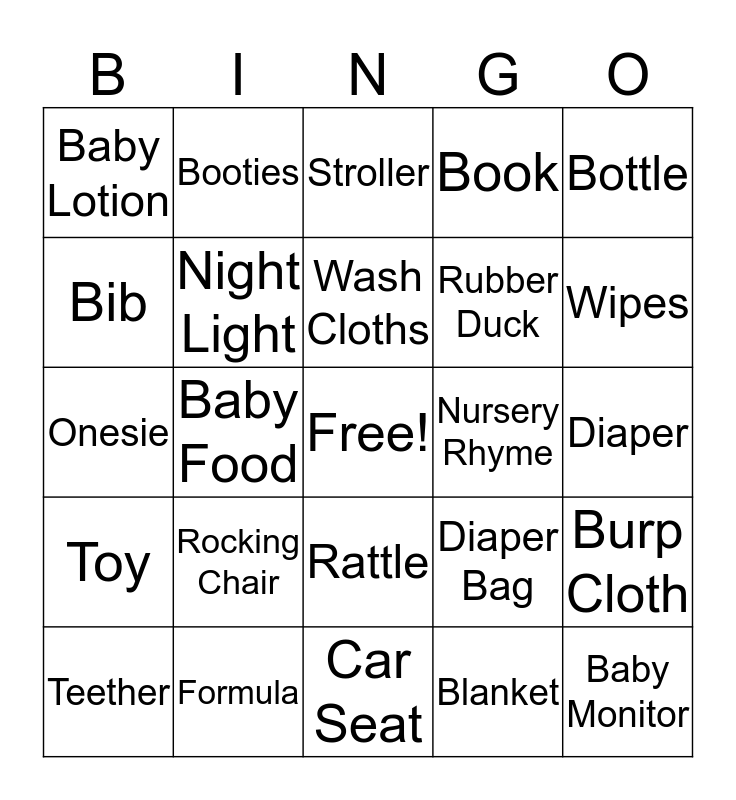 This bingo card has a free space and 26 words: Rattle, Blanket, Wash Cloths, Formula, Bottle, Baby Lotion, Bib, Booties, Diaper, Diaper Bag, Rubber Duck, Onesie, Burp Cloth, Teether, Baby Food, Pacifier, Book, Toy, Stroller, Baby Monitor, Wipes, Car Seat, Nursery Rhyme, Rocking Chair, Night Light and High Chair.