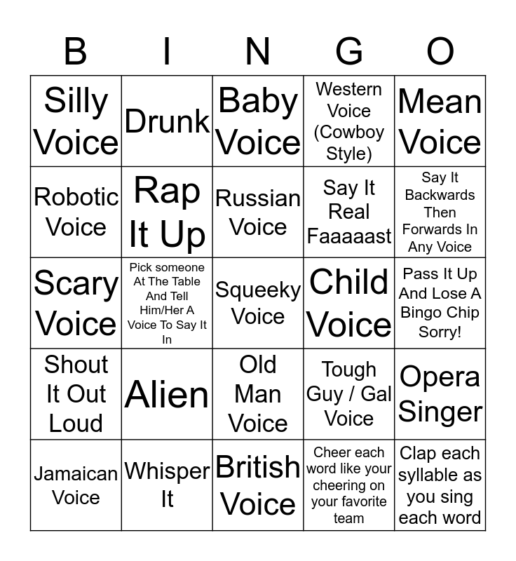 This bingo card has 25 words: Alien, British Voice, Russian Voice, Jamaican Voice, Mean Voice, Silly Voice, Robotic Voice, Drunk, Child Voice, Old Man Voice, Say It Real Faaaaast, Scary Voice, Tough Guy / Gal Voice, Opera Singer, Rap It Up, Clap each syllable as you sing each word, Pass It Up And Lose A Bingo Chip Sorry!, Baby Voice, Say It Backwards Then Forwards In Any Voice, Pick someone At The Table And Tell Him/Her A Voice To Say It In, Squeeky Voice, Whisper It, Shout It Out Loud, Western Voice (Cowboy Style) and Cheer each word like your cheering on your favorite team.