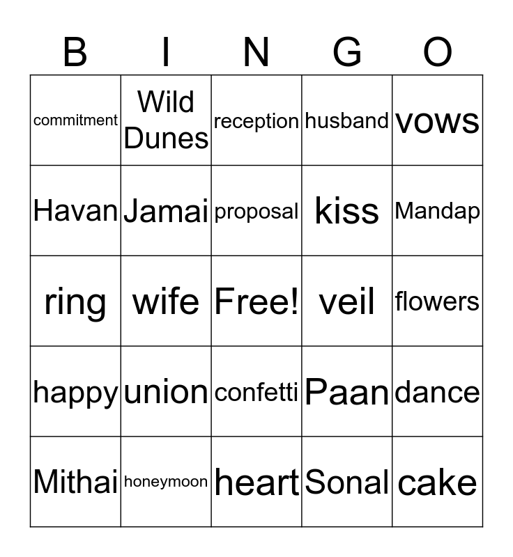 This bingo card has a free space and 41 words: Love, ring, Dulhan, Jamai, honeymoon, confetti, proposal, engagement, vows, happy, wife, husband, cake, flowers, veil, union, spouse, commitment, ceremony, reception, dance, champagne, heart, kiss, Charleston, Vivek, Sonal, Sari, Mandap, puja, sangeet, Wild Dunes, Mithai, Ladoo, Paan, Havan, Mangalsutra, Jaan, Bangle, Tikka and Phera.