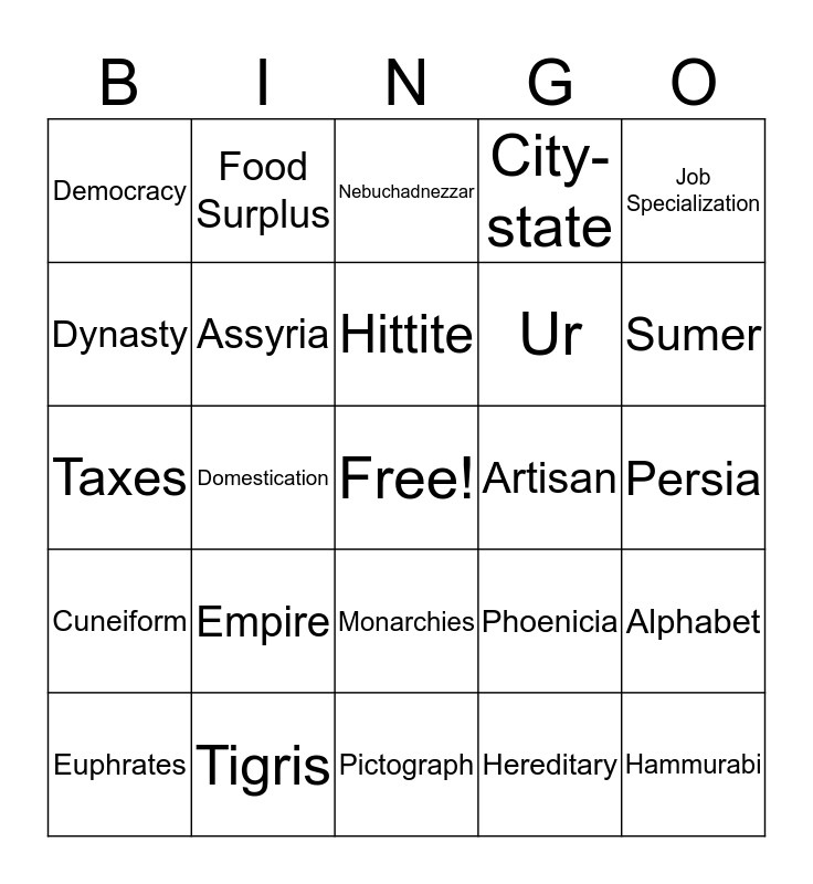 This bingo card has a free space and 36 words: Civilization, Polytheistic, Monotheistic, Assyria, Phoenicia, Cuneiform, Hittite, Babylonia, Job Specialization, Social Classes, Domestication, City-state, Scribe, Artisan, Sumer, Democracy, Irrigation, Empire, Hammurabi, Nebuchadnezzar, Persia, Alphabet, Tigris, Euphrates, Pictograph, Food Surplus, Taxes, Public Works Project, Ur, Dynasty, Patriarchal System, Fertile Crescent, Hereditary, Monarchies, Merchant and Persian Gulf.