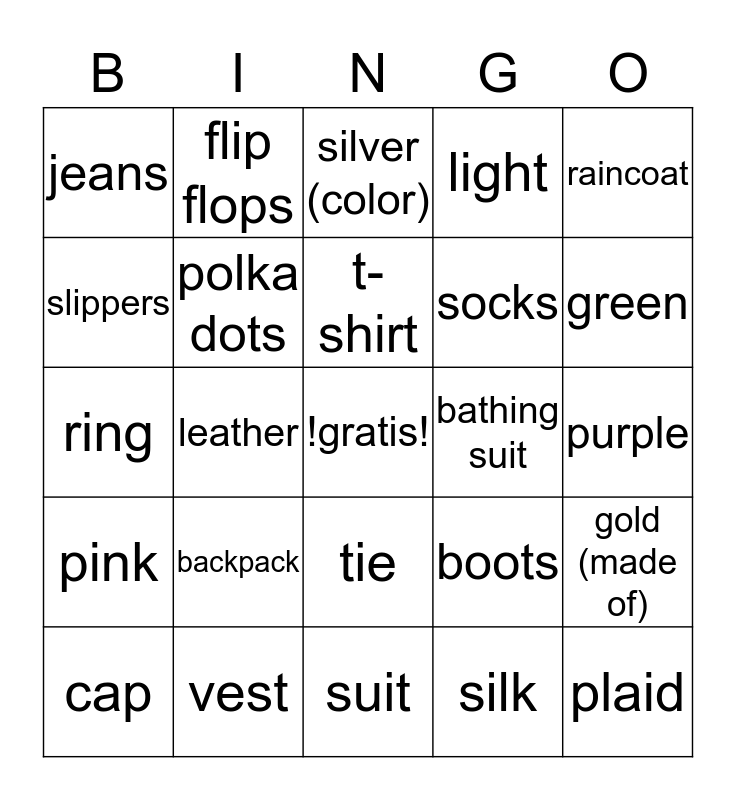 This bingo card has a free space and 24 words: backpack, vest, t-shirt, cap, raincoat, jeans, slippers, flip flops, bathing suit, tie, socks, ring, boots, gold (made of), polka dots, silk, purple, silver (color), green, leather, plaid, pink, light and suit.