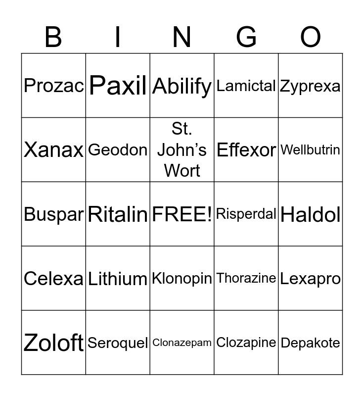 This bingo card has a free space and 24 words: Lithium, Seroquel, St. John’s Wort, Zoloft, Zyprexa, Prozac, Xanax, Paxil, Risperdal, Klonopin, Effexor, Buspar, Thorazine, Lexapro, Geodon, Clozapine, Haldol, Abilify, Wellbutrin, Ritalin, Depakote, Celexa, Lamictal and Clonazepam.