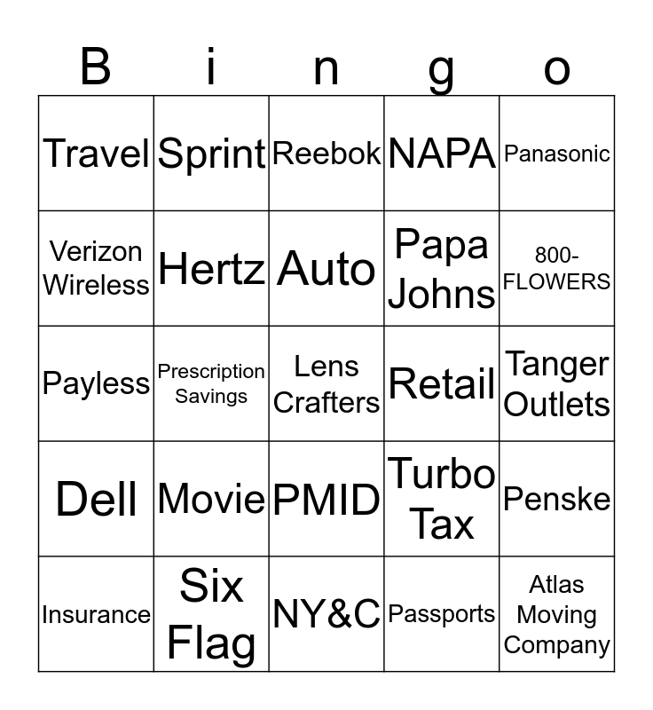 This bingo card has a free space and 24 words: Movie, Six Flag, Auto, Insurance, Panasonic, Travel, Verizon Wireless, Sprint, Retail, PMID, Papa Johns, Payless, Turbo Tax, Penske, Hertz, Passports, Tanger Outlets, Reebok, 800-FLOWERS, Prescription Savings, Atlas Moving Company, Dell, NAPA and NY&C.