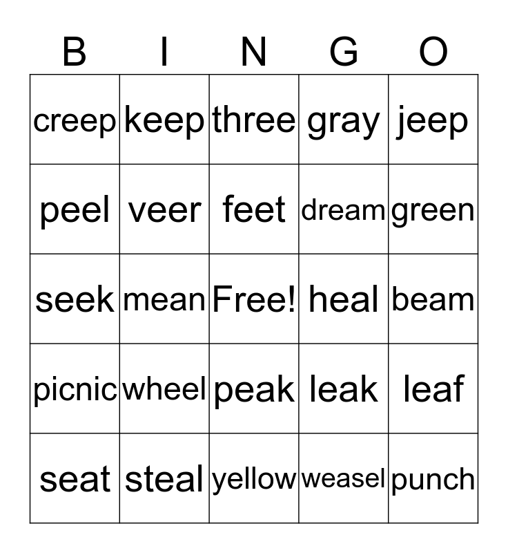 This bingo card has a free space and 24 words: wheel, steal, feet, seat, jeep, creep, peel, keep, heal, peak, dream, seek, leak, leaf, veer, weasel, beam, three, green, mean, punch, picnic, gray and yellow.